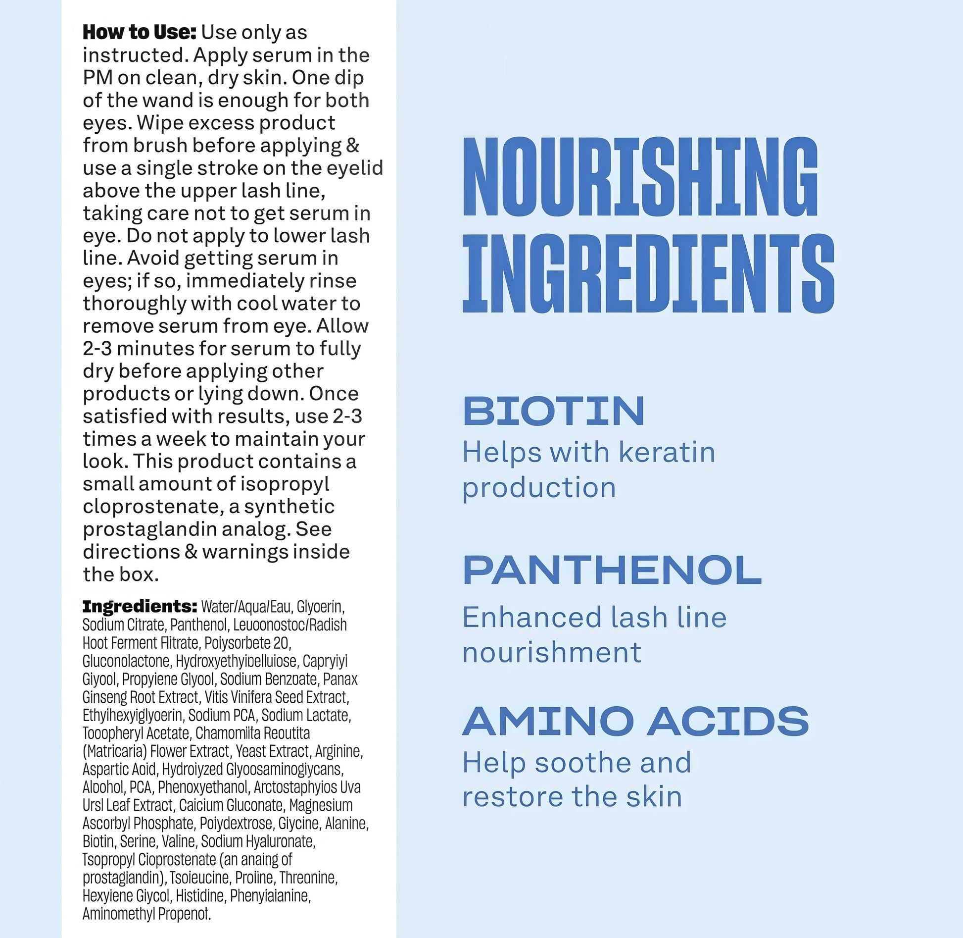 Use only as instructed. Apply serum in the PM on clean, dry skin. One dip of the wand is enough for both eyes. Wipe excess product from brush before applying & use a single stroke on the eyelid above the upper lash line, taking care not to get serum in eye. Do not apply to lower lash line. Avoid getting serum in eyes; if so, immediately rinse thoroughly with cool water to remove serum from eye. Allow 2-3 minutes for serum to fully dry before applying other products or lying down. Once satisfied with results, use 2-3 times a week to maintain your look. This product contains a small amount of isopropyl cloprostenate, a synthetic prostaglandin analog. See directions & warnings inside the box.